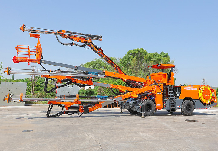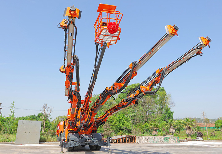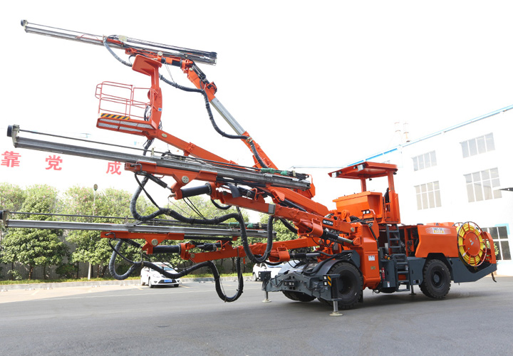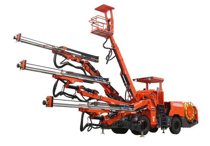 DW3-180三臂(液壓)鑿巖臺車是一款三臂鑿巖設備,采用三套鉆臂為獨立液壓系統控制,鉆臂可伸縮覆蓋面積廣,設有一套高空服務吊籃可為裝藥、排險、掛網等輔助工作提供升降平臺。為高速高鐵、水利水電工程、以及國防等中大型隧道掘進鉆孔作業而研發制造的鑿巖裝備,滿足鑿巖掘進需要的各種炮孔、錨桿孔、小導管支護、注漿孔等;該機工作時采用全液壓驅動,電液比例閥控系統控制鉆臂鑿巖,動作柔順定位迅速、鑿巖速度快,全實時液壓平動式鉆臂使推進梁全方位可保持平行,設有自動防卡釬、鑿巖完畢停止沖擊、退桿等功能;柴油機供行走,四輪四驅、動力強勁、轉場靈活,整機結構布置緊湊、重心低、機動靈活、系統穩定,不僅提升安全保障和工作效率,也能降低勞動者的工作強度。電腦自動化控制系統高度精度的掌控鉆臂按預先設計好布孔圖有序一鍵完成自動鉆孔,可精確自動控制鉆孔孔位、推進梁角度和孔深,同時顯示器精確顯示實時鉆孔情況。