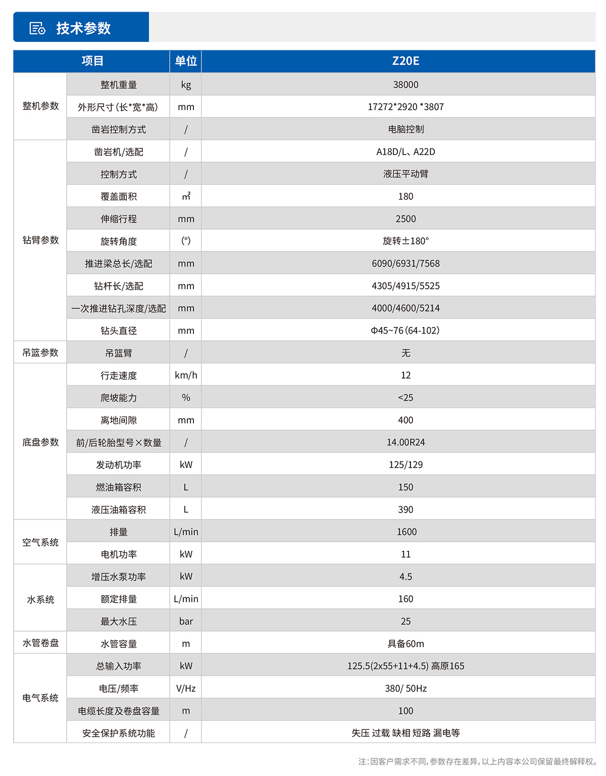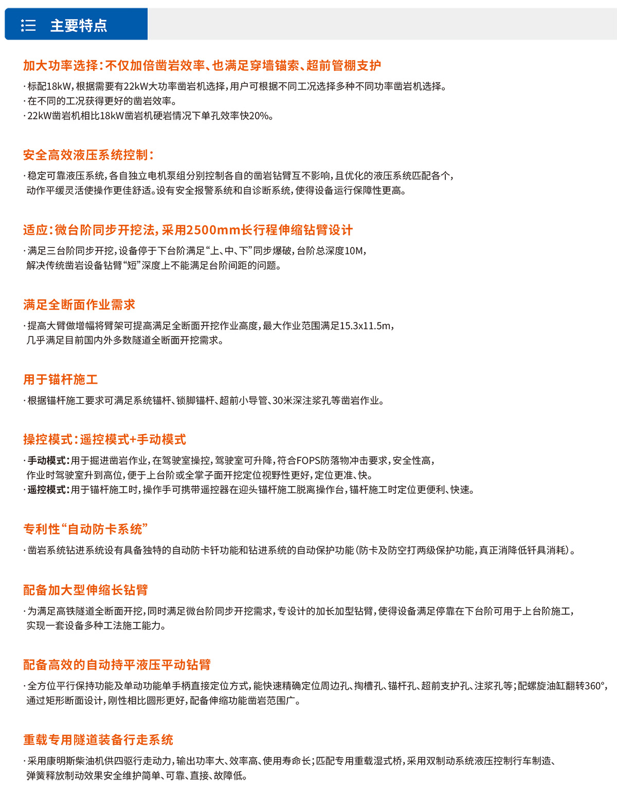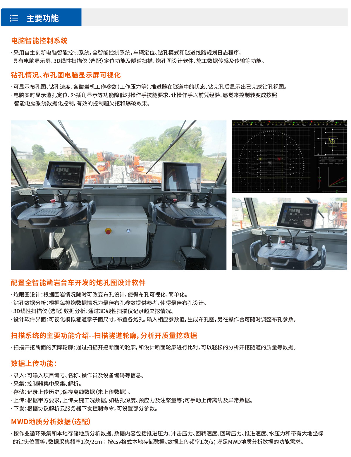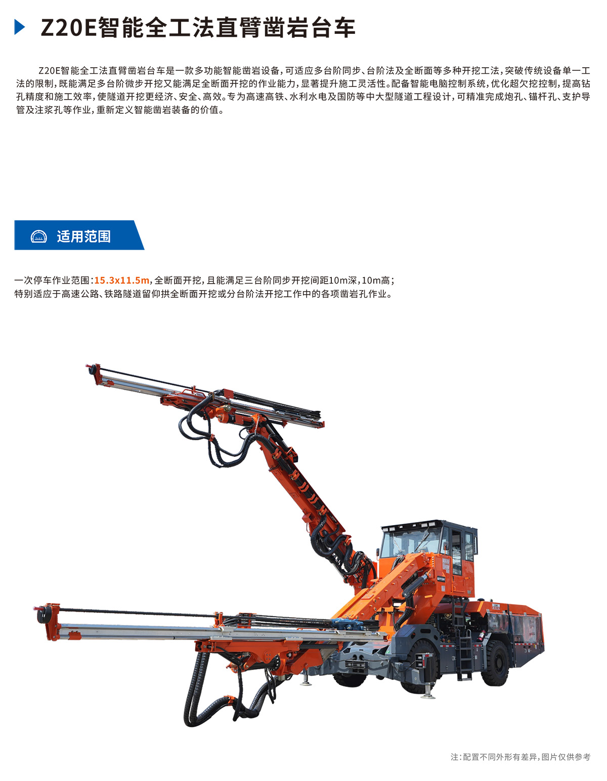 Z20E智能全?法直臂鑿巖臺?是?款多功能智能鑿巖設備,可適應多臺階同步、臺階法及全斷?等多種開挖?法,突破傳統設備單??法的限制,既能滿?多臺階微步開挖?能滿?全斷?開挖的作業能?,顯著提升施?靈活性。配備智能電腦控制系統,優化超?挖控制,提?鉆孔精度和施?效率,使隧道開挖更經濟、安全、?效。專為?速?鐵、?利?電及國防等中?型隧道?程設計,可精準完成炮孔、錨桿孔、?護導管及注漿孔等作業,重新定義智能鑿巖裝備的價值。